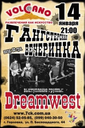 14 января, в день празднования Старого Нового года в гостях у концерт-холла "VOLCANO" старые друзья - кавер-бэнд «Dream West». Этот вечер Вы проведете в атмосфере Чикаго 30-х годов, весёлых мафиозных разборок, времени сухого закона и борьбы с ним, кабаре и казино. Романтика этого времени захватывает дух и завораживает по сей день... Смокинги, шляпы, бабочки, галстуки, сигары, пистолеты (конечно, игрушечные).