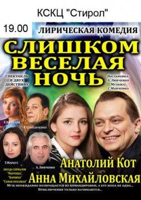 Спектакль московского театра "АРБАТ", лирическая комедия "СЛИШКОМ ВЕСЕЛАЯ НОЧЬ",в ролях:АННА МИХАЙЛОВСКАЯ, В. АНДРЕЕВ, А.КОТ, Е.КИБКАЛО и другие