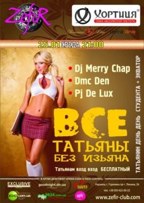 Только в Cocktail Hall"ZEFIR" настоящий День Студента !!! Вернись в свое славное студенство и вспомни, как это было!!! Будь вместе с нами на одной из лучших вечеринок города!!! в программе: -Всю ночь играет DJ Mtrry Chap -DMC Den -Фоторепортаж от знатных фотографов -Коктейли от всеми любимых барменов -Всех Татьян ожидают подарки -Студенческая атмосфера