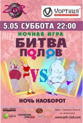 День и Ночь. Свет и Тьма. Разум и Чувства. Инь и Янь. Он и Она. Вечное противостояние противоположностей! В эту субботу, мы поставим точку в вечном споре между мужчиной и женщиной в клубе Cocktail Hall ZEFIR! Невероятном сражении, наполненном страстью, вы сможете определить: какой пол является главным – женский или мужской? 5 мая в 22:00 Cocktail Hall ZEFIR ждет вас!!!
