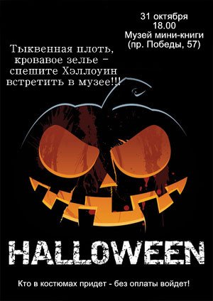 Впервые в Музее миниатюрной книги празднование самого страшного и ужасного дня осени! Развлекательная программа, познавательная информация об истоках праздника Хэллоуин, необычные угощения! Приглашаем всех, кто хочет незабываемо провести вечер 31-ого октября! В карнавальных костюмах вход бесплатный!