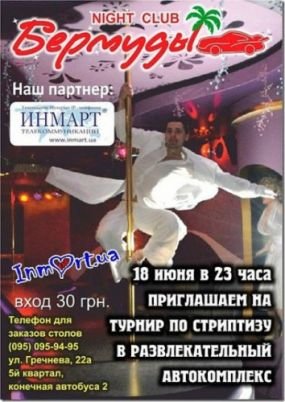 Турнир по стриптизу проходит в четыре этапа, каждую неделю для вас будут танцевать новые танцоры. Жюри по турниру являются посетители заведения. Дни проведения турнира: 10, 18, 26 и 30 июня 2011 года, начало в 23.00 вход 30 грн.