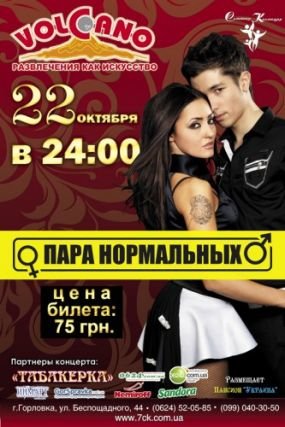 22 октября, суббота, 24:00 Развлекательный центр "VOLCANO" Концерт группы "ПАРА НОРМАЛЬНЫХ" в новом составе - Артём Мех и Анна Добрыднева! Супер-хиты группы и презентация новой песни "Ах, Ира!" Цена билета - 75 грн.! Приобретай билеты прямо сегодня! Количество ограничено!