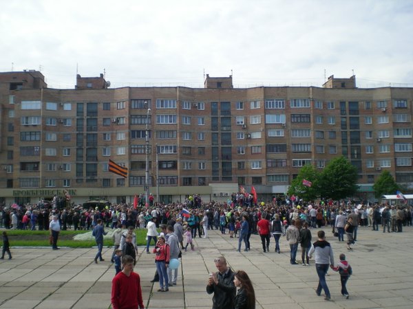 По центральной улице оккупированного города – проспекту Победы – 9 мая прошло торжественное шествие. В колоннах шли сотни горловчан с флагами “ДНР” и транспарантами.
