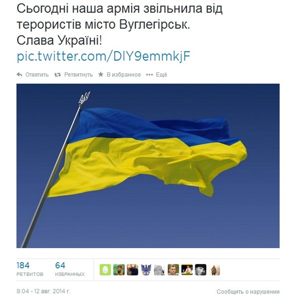 "Сегодня наша армия освободила от террористов город Углегорск. Слава Украине!", - сказано в сообщении главы государства.